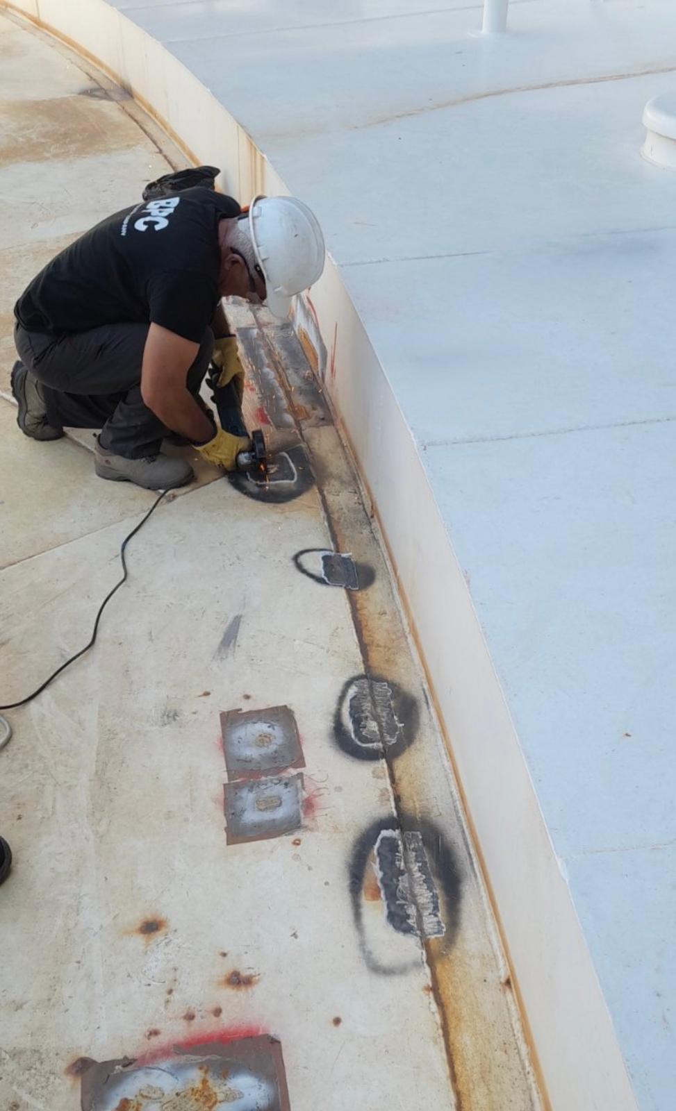 The scope of work included MFL inspection of the bottom and annular plates; patch repairs of bottom plates; plating patches for the ladder runway; painting touch-up works on the bottom and roof plates; replacement of floating roof accessories; repairs to the roof sealing system; repairs to the concrete ring beam and installation of sealing protection system on the tank’s chime area; and replacement of the roof drain sump along with installation of a new roof drain hose system.